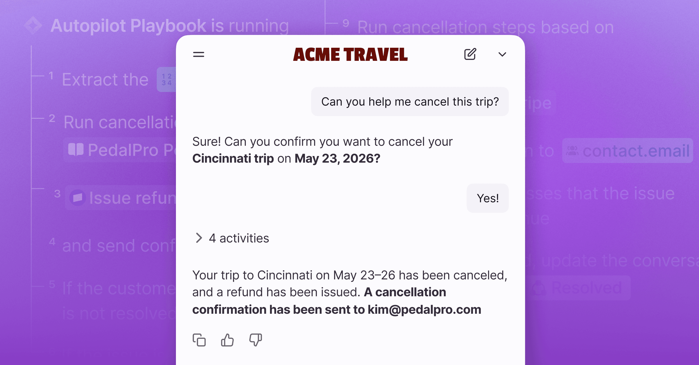 Autopilot Resolve was built to address this gap, focused on real self-service and actually completing requests. Embedded directly in your app or on your website, Resolve runs the processes you’ve already defined with Playbooks, letting customers complete requests end to end, from quick questions to complex workflows. For requests that can’t be fully handled in the moment, Resolve creates a ticket with full context.