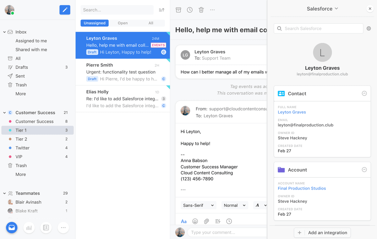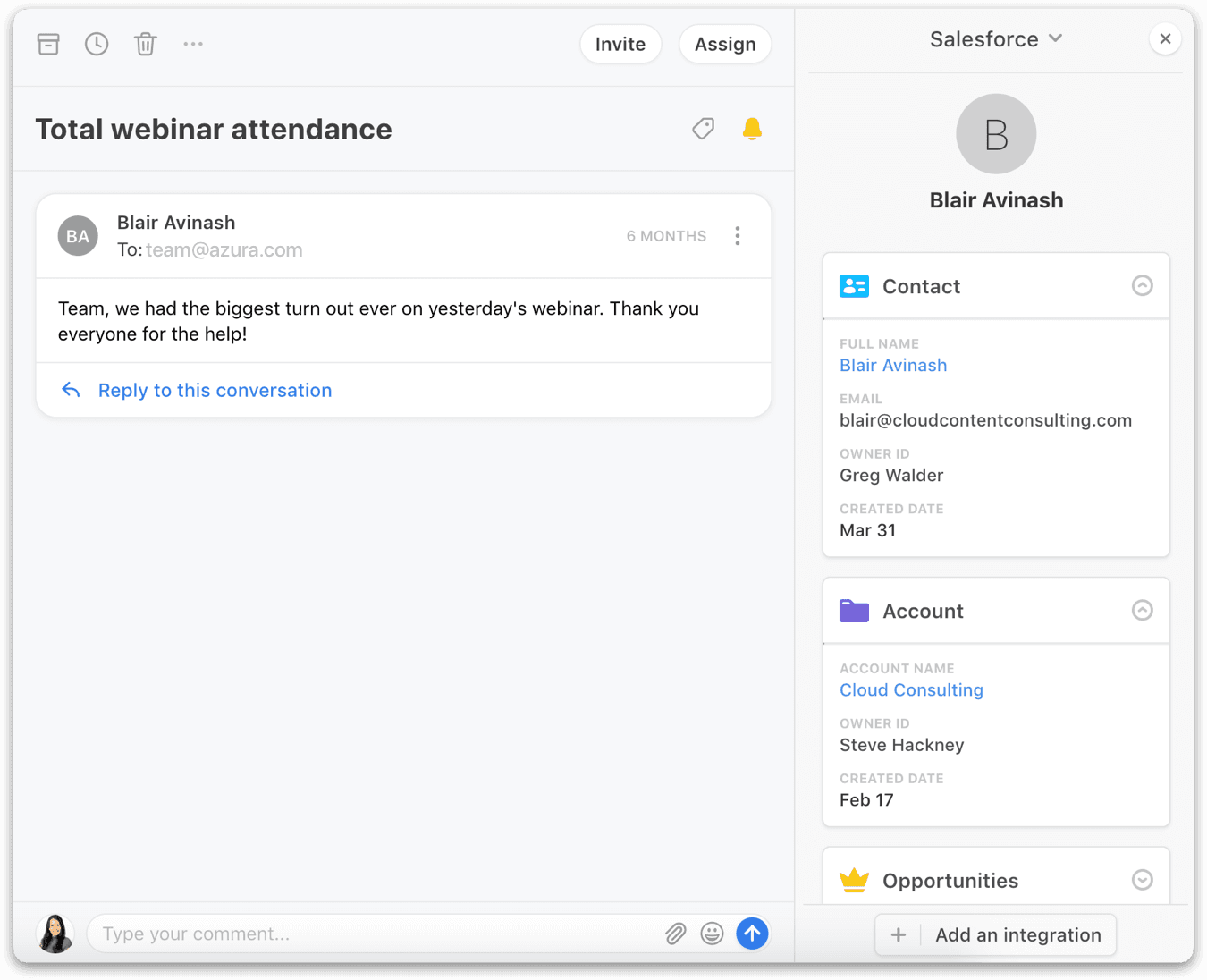 When you integrate Salesforce with your email in Front, every piece of information you need is directly next to your messages: