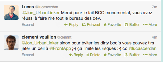 Don’t hesitate to be opportunistic from time to time. For example one day we saw a lot of people mocking a recruiting agency which did a mistake. They had sent an email to many developers telling them they had a lot of job opportunities. The problem is that they sent the email with everyone in cc instead of bcc… It was a perfect match for us as Front is designed to avoid this kind of mistake. Perfect time to jump in ? (we got a couple of beta testers after this one)
