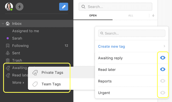 You can also customize which tags you see in your individual workspace for one click access to messages with that tag. You can choose private tags or shared team tags, so you can seamlessly switch between your individual and team work without juggling multiple tools.