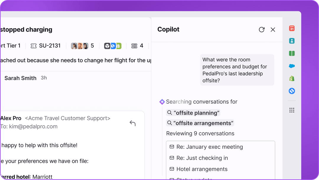 Good responses require full context. Copilot pulls it all together from your conversations and connected tools, so your team is always up to speed. Search past conversations, get instant answers from your CRM and billing tools, and see the full customer picture across teams, without jumping between tabs.