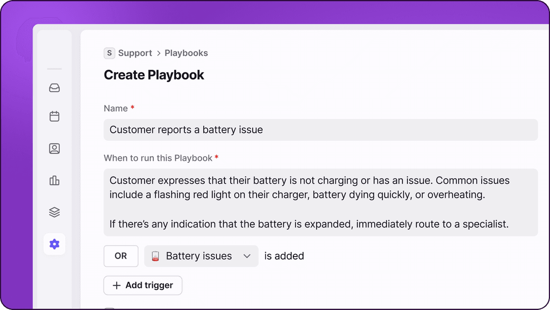 Playbooks let AI coordinate end to end, running your existing processes across systems and teams. Guardrails and handoffs keep humans in the loop when judgment matters, and Playbooks can dynamically handle variations in customer responses.