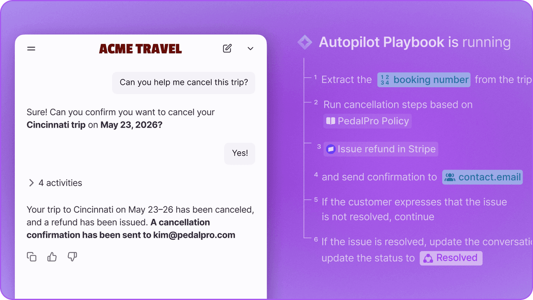 Customers don’t want faster acknowledgment, they want the job done. Autopilot Resolve is built for the hard stuff. Embedded in your app or site, it runs Playbooks end to end, from quick lookups to multi-step workflows. And when something does need a human, it arrives with all the context already in place, so your team never starts from scratch.