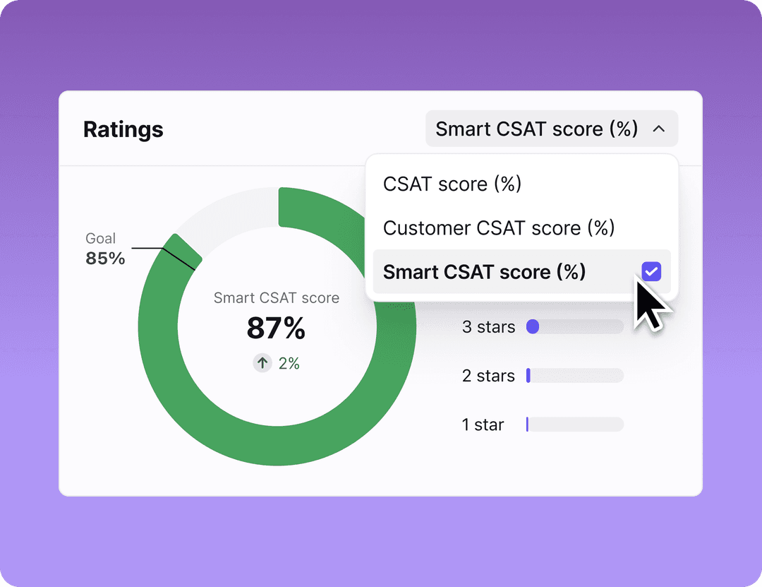 Smart CSAT gives you a complete view of customer satisfaction by automatically inferring satisfaction scores on every ticket. No more crossing your fingers that customers fill out surveys, and no more skewed results from the handful who do.