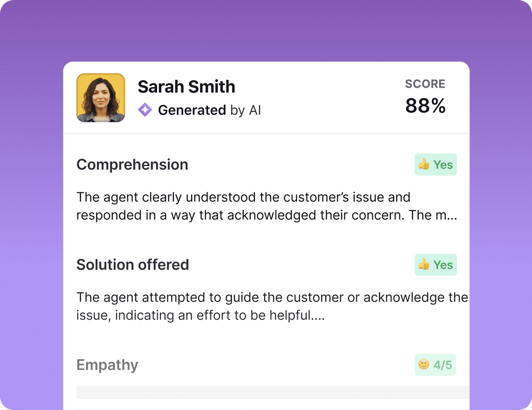 Smart QA does the grading for you, automatically generating scorecards on every closed ticket and surfacing insights in a dedicated dashboard. Get a clear, accurate picture of how your team is actually performing without the sampling, the guesswork, or the hours. Spend less time reviewing and more time improving.