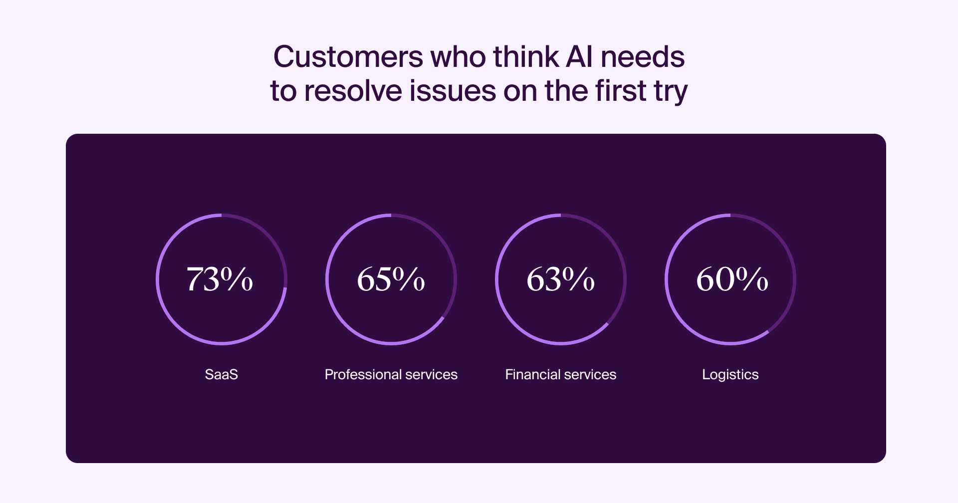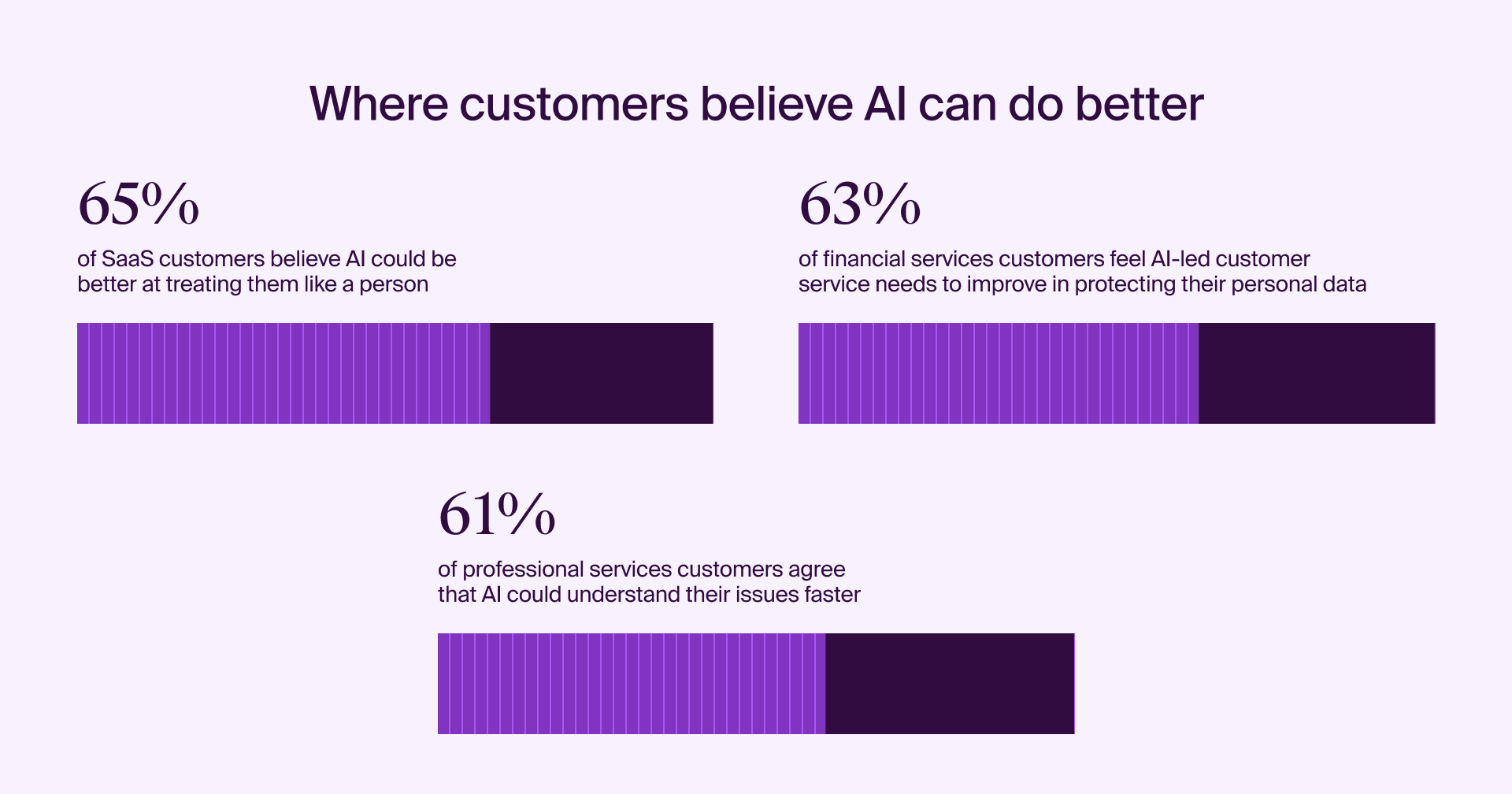 Each of the four industries agrees that AI-led customer service could be better at solving their problems the first time.