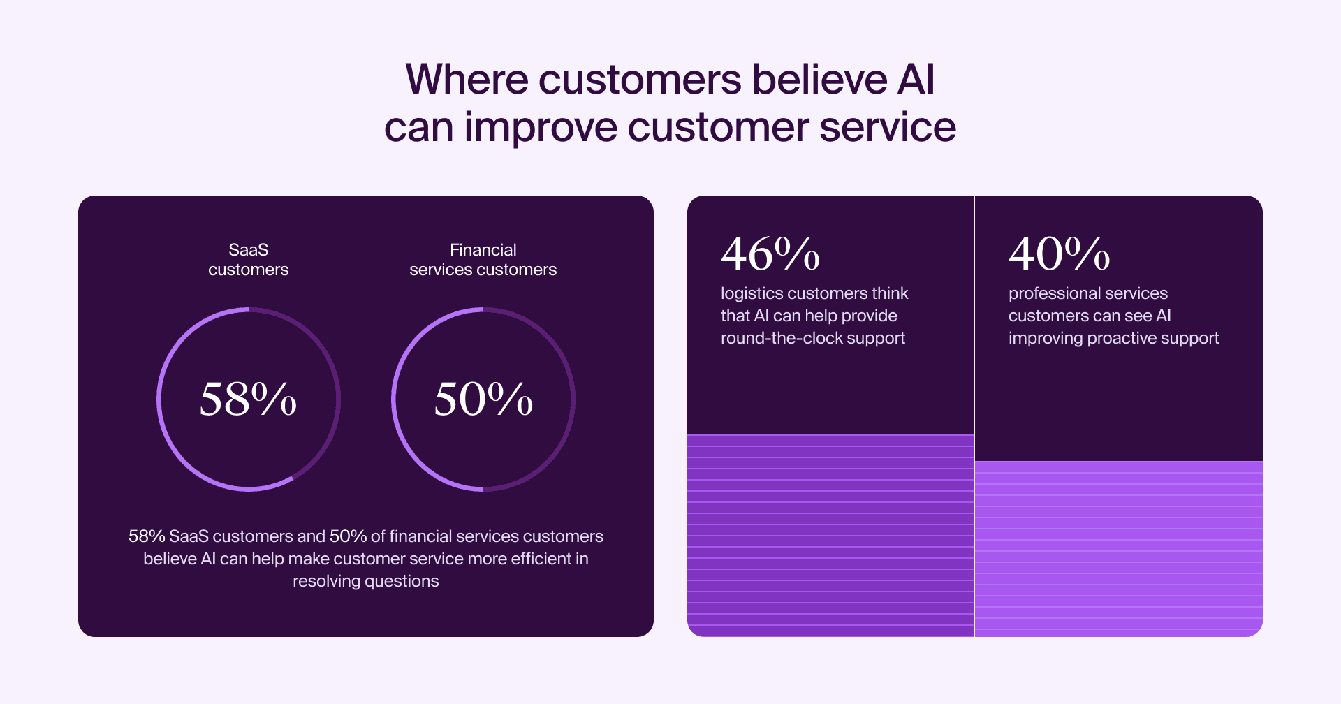 The bottom line? Customer expectations aren’t just shaped by their own AI usage. They’re shaped by the norms of their industry, too. For industries that have historically been very human-first, they might face slower adoption rates of their AI-powered service.