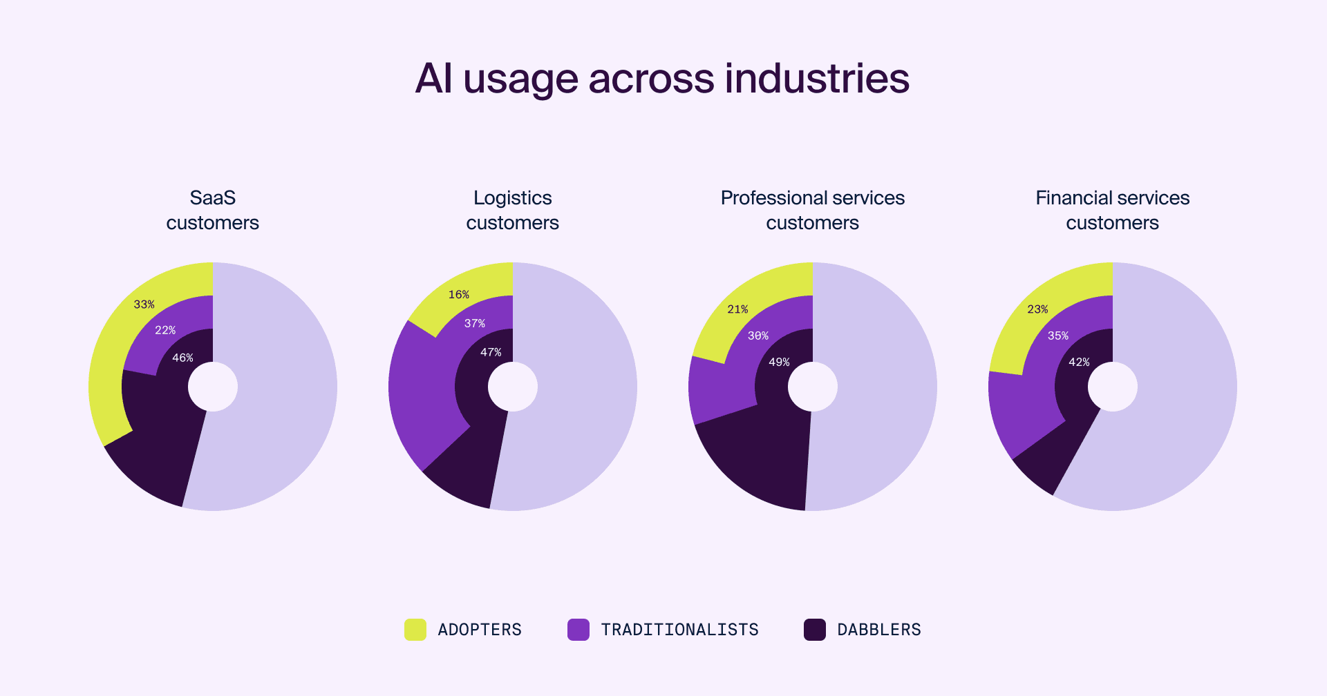 Professional services show balanced adoption: While having a significant Dabbler segment (49%), professional services have a lower percentage of Traditionalists than logistics and financial services, signaling these customers are curious about AI without fully committing. This balance leads to steady, thoughtful integration of AI in workflows, rather than rapid or resistant adoption.