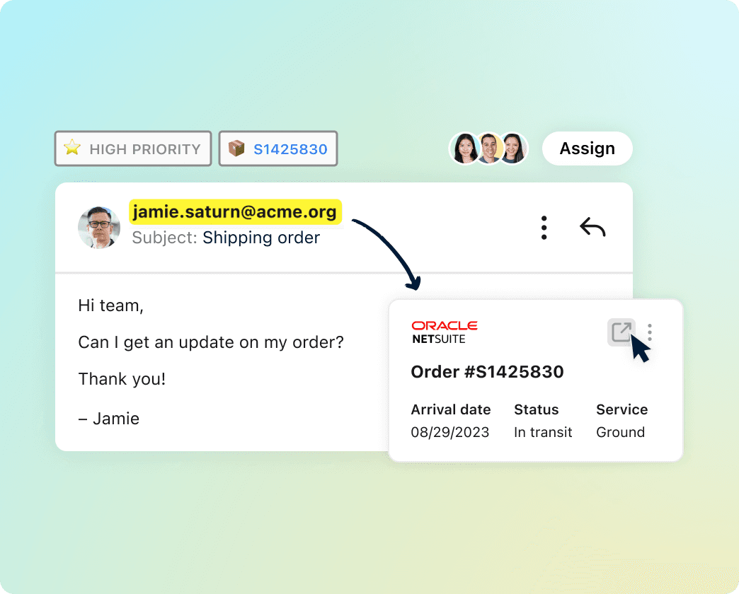 In addition to being able to recognize key info (like order ID, booking numbers, etc.) in a message and connect these records with the conversation, Connectors take contextual third party data to a whole new level. For example, you can set up your Connector to recognize the sender’s email address, and automatically pull up associated business objects like order number, even though the sender didn’t mention it. This can help speed up resolution time since your agent and customers won’t have to deal with the back-and-forth of sharing additional information.