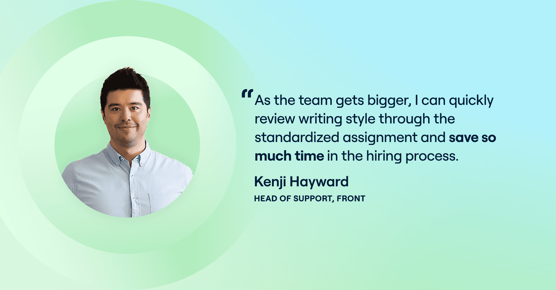 It’s hard to know someone’s support tone and how they’ll interact with customers from only an email or an interview. At Front, Kenji and team have created a scalable process by designating a written interview question they use for every hire that helps them assess quality of responses. Then, Kenji and team can review the writing sample and see if the candidate’s writing tone is a fit for their brand and support voice.