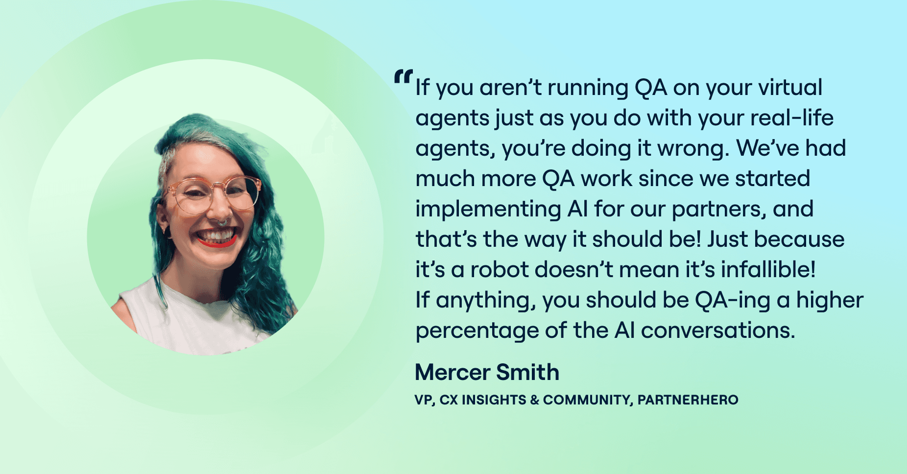 “If you aren’t running QA on your virtual agents just as you do with your real-life agents, you’re doing it wrong. We’ve had much more QA work since we started implementing AI for our partners, and that’s the way it should be! Just because it’s a robot doesn’t mean it’s infallible! If anything, you should be QA-ing a higher percentage of the AI conversations.” - Mercer Smith