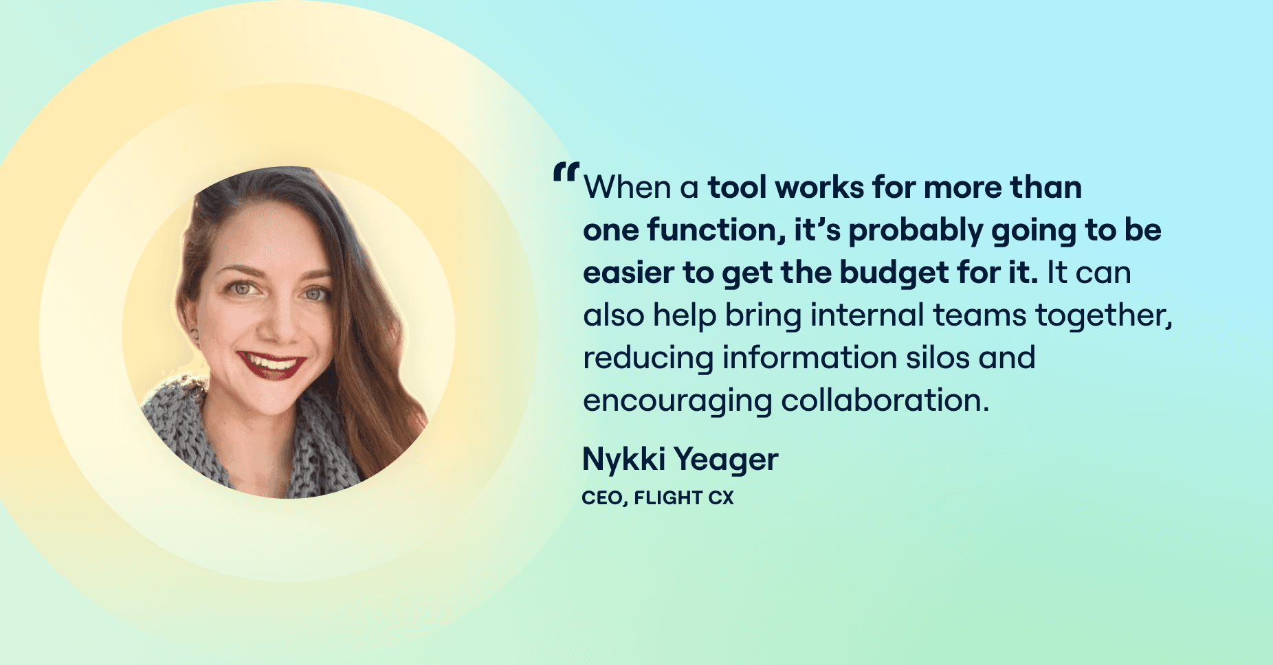 “When a tool works for more than one function, it’s probably going to be easier to get the budget for it. It can also help bring internal teams together, reducing information silos and encouraging collaboration.” - Nykki Yeager