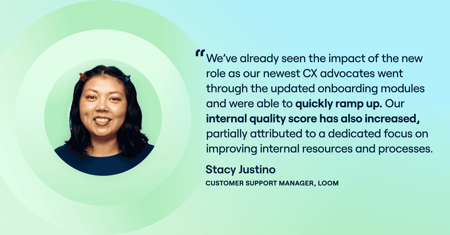 Stacy and team have already seen the impact of the new role as their newest CX advocates went through the updated onboarding modules and were able to quickly ramp up. Their internal quality score has also increased, partially attributed to a dedicated focus on improving internal resources and processes.