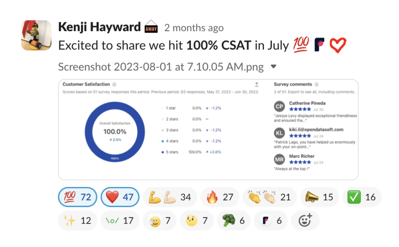 “It’s amazing that we hit 100% and we can maintain it! I’m so proud of that. As we scale, we need to find ways to continue celebrating it. We do this by sending CSAT wins to company-wide slack channels and customer appreciation channels. Keep people motivated, and make getting and maintaining a high CSAT score as critical and fun to celebrate as sales ringing the gong for a new business win.” - Kenji Hayward
